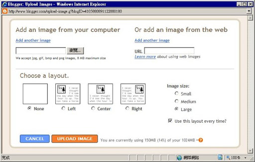 在Google Blogger編輯網誌時,插入圖片後,會出現下列的對話框,會出現圖片排版的方式,預設方式實沒有排版,也就是圖片與文字沒有「文繞圖」效果。